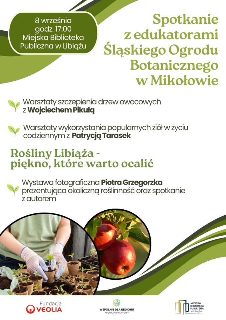 W projekcie przewidziano także edukacyjne działania dla dorosłych. W poniedziałek 8 września o 17:00 w bibliotece odbędą się warsztaty, które poprowadzą edukatorzy z Śląskiego Ogrodu Botanicznego w Mikołowie – uczestnicy nauczą się szczepienia drzew owocowych oraz wykorzystania ziół w życiu codziennym. Równocześnie zostanie zaprezentowana wystawa fotograficzna pt. „Rośliny Libiąża – piękno, które warto ocalić” Piotra Grzegorzka.