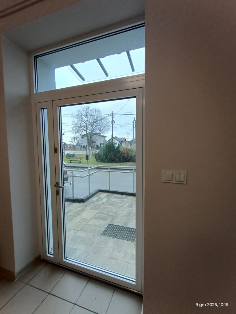 - Wykonanie pochylni dla osób niepełnosprawnych ze spocznikiem i górną płaszczyzną ruchu przy wejściu do biura, wraz z balustradą obustronną z pochwytami dostosowanymi dla osób niepełnosprawnych, montaż zadaszenia nad wejściem do budynku;